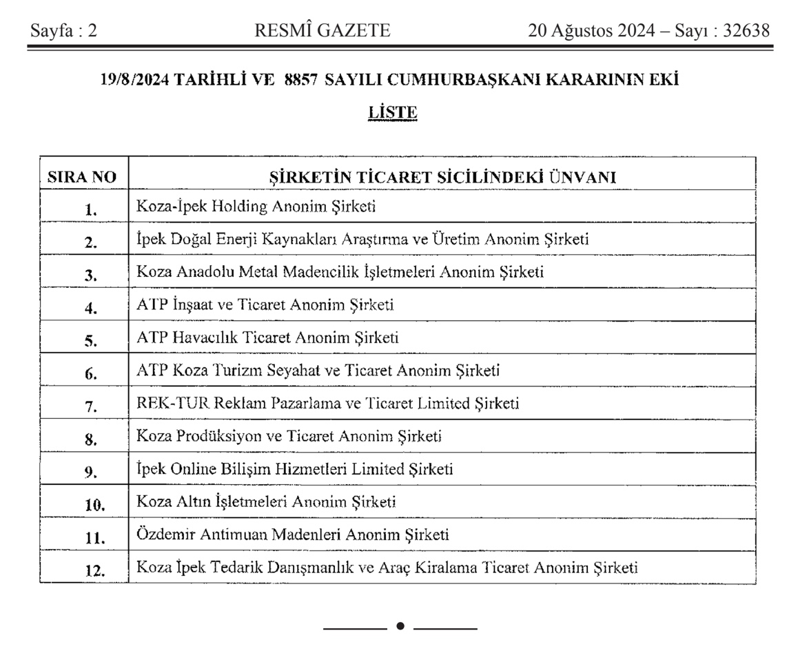 Hisseleri TVF'ye aktarılan şirketler arasında, Koza-İpek Holding, İpek Doğal Enerji Kaynakları Araştırma ve Üretim, Koza Anadolu Metal Madencilik İşletmeleri ve ATP İnşaat ve Ticaret gibi çeşitli sektörlerden firmalar yer alıyor. Ayrıca, ATP Havacılık Ticaret, ATP Koza Turizm Seyahat ve Ticaret, REK-TUR Reklam Pazarlama ve Ticaret, Koza Prodüksiyon ve Ticaret, Ipek Online Bilişim Hizmetleri, Özdemir Antimuan Madenleri ve Koza İpek Tedarik Danışmanlık ve Araç Kiralama gibi şirketler de listeye dahil oldu.