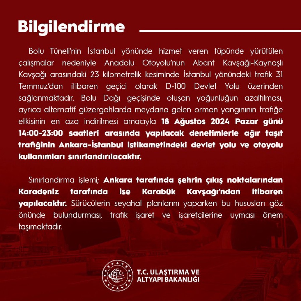 Bakanlık tarafından yapılan açıklamada, Bolu Dağı geçişindeki yoğunluğun azaltılması ve alternatif güzergahlarda meydana gelen orman yangınının trafiğe etkisinin en aza indirilmesi amacıyla, 14.00-23.00 saatleri arasında ağır taşıt trafiğinin sınırlanacağı bildirildi. Bu önlem, Ankara-İstanbul istikametindeki devlet yolu ve otoyol kullanımlarını etkileyecek.Sınırlandırma uygulamasının, Ankara tarafında şehir çıkış noktalarından, Karadeniz tarafında ise Karabük Kavşağı'ndan itibaren başlayacağı ifade edilirken, sürücülerden seyahat planlarını bu bilgilere göre yapmaları ve trafik işaretlerine uymaları gerektiği vurgulandı.Yetkililer, bu geçici düzenlemenin, yol güvenliğini artırmayı ve trafik akışını düzenlemeyi hedeflediğini belirtti.