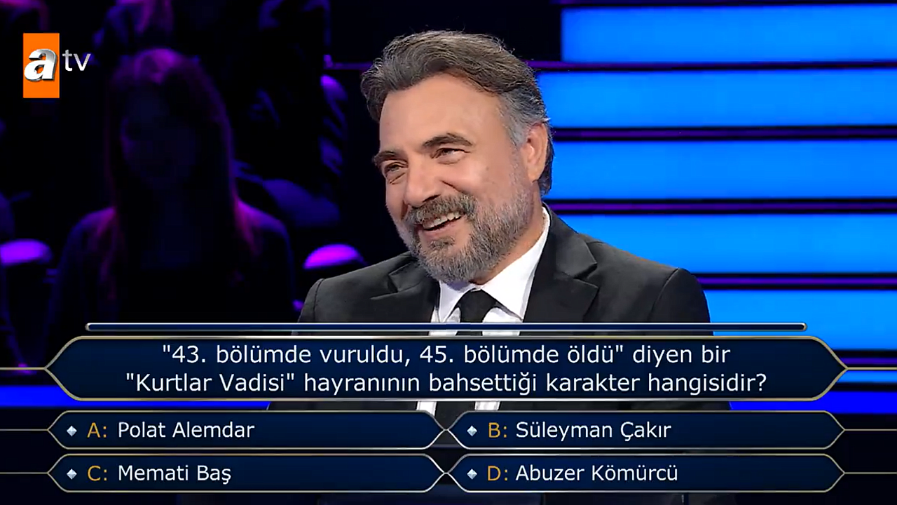 ATV’nin popüler bilgi yarışması Kim Milyoner Olmak İster, yeni sunucusu Oktay Kaynarca ile devam ederken, yarışmada sorulan bir soru sosyal medyada büyük ilgi gördü. "Kurtlar Vadisi" dizisinden bir karakterle ilgili olan bu sorunun cevabı ise, yarışmanın sunucusu Oktay Kaynarca’nın canlandırdığı Süleyman Çakır karakteriydi, bu da soruyu daha da dikkat çekici hale getirdi.