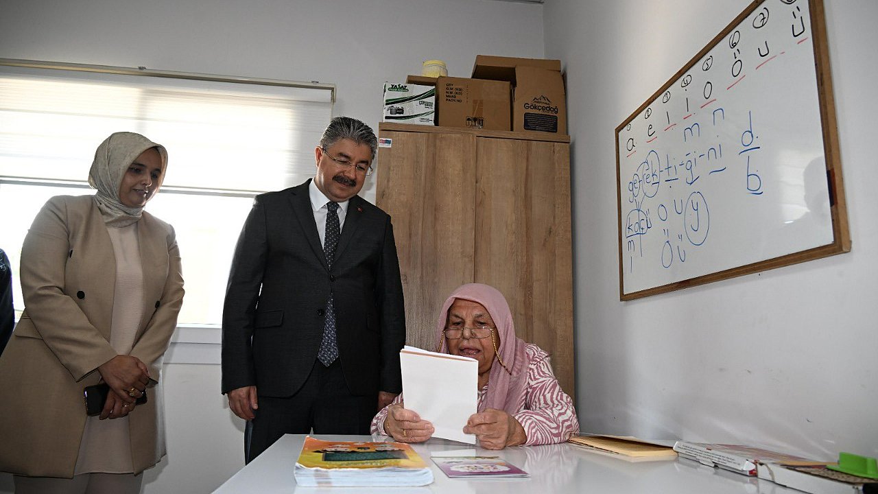Osmaniye Valisi Dr. Erdinç Yılmaz, Osmaniye Gündüz Bakım ve Aktif Yaşam Merkezi'nde okuma yazma öğrenen 86 yaşındaki Ayşe Aydoğan'ı ziyaret ederek, azmi ve başarısından dolayı tebrik etti.